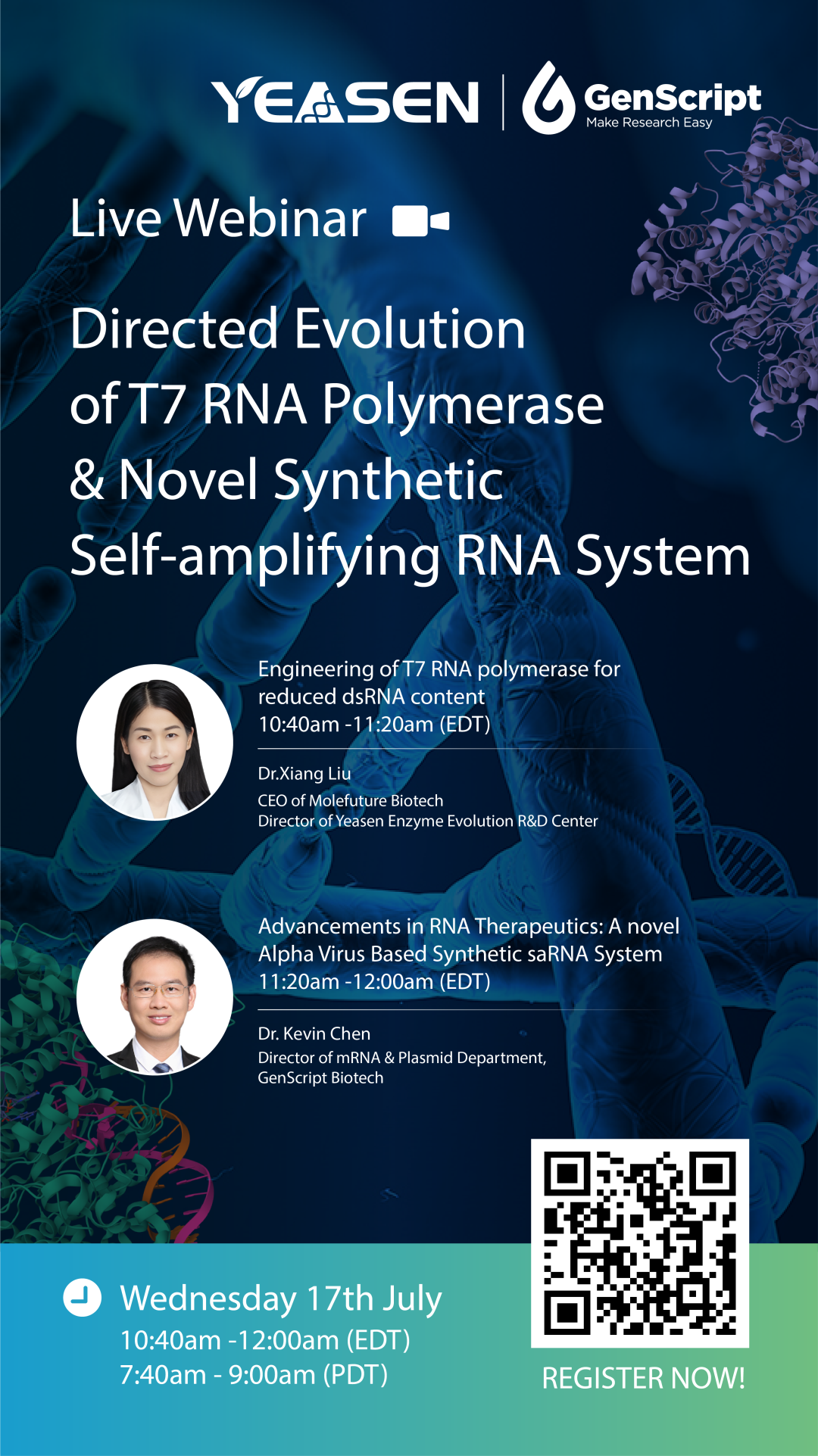 翌圣镁孚泰生物将携手金斯瑞生物,举办海外专场直播《 Directed Evolution of T7 RNA Polymerase & a Novel Synthetic Self-amplifying RNA System》,探讨酶定向进化技术与新型自扩增RNA(saRNA)合成系统的应用潜力和发展趋势。金斯瑞生物的新一代mRNA疫苗和疗法的saRNA合成系统有望加速疫苗和治疗药物开发进程。与此同时,翌圣镁孚泰利用其ZymeEditor™平台改造T7 RNA聚合酶,减少dsRNA含量至野生型的2%(了解详情),有望推动高效、高纯度mRNA合成。