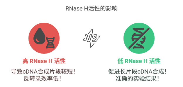但如果RNase H活性较强,在cDNA合成过程中,RNA模板可能会在cDNA合成完成之前就被降解,导致cDNA链的长度较短,所以RNase H活性是长片段cDNA合成过程中需要规避的因素。此外,RNase H活性还可能会与反转录酶中的聚合酶活性竞争,从而降低反转录效率。以上特性极大的影响了基因表达分析、cDNA文库构建、RNA测序等实验研究的精准性。比如在RNA测序实验中,需要获得高质量、完整的cDNA文库。高RNase H活性可能会破坏RNA模板,影响cDNA文库的构建质量,导致测序结果的准确性降低,无法准确反映原始RNA的表达情况和序列信息。