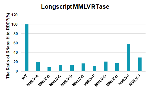 图3:以WT的RNase H活性与RDDP活性的比值为100%,镁孚泰长片段MMLV反转录酶筛选试剂盒(Cat.No.LT002-01)10种酶相对WT的RNase H/RDDP活性比值数据图。