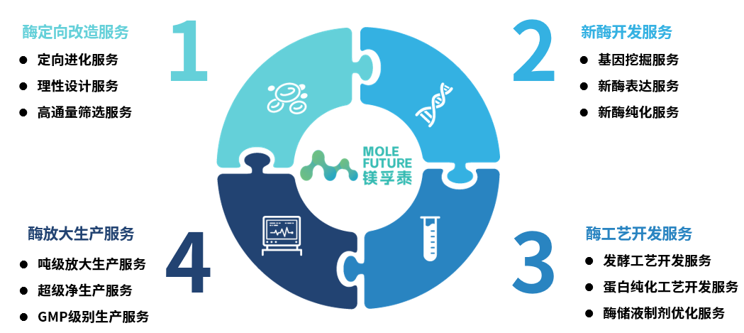 镁孚泰生物科技(上海)有限公司(镁孚泰生物,Molefuture)是翌圣生物科技(上海)股份有限公司旗下的全资子公司,是一家以酶进化技术为驱动、专注于提供酶改造定制化解决方案的创新型企业。依托于翌圣生物,镁孚泰生物现有六大技术平台:ZymeEditor创新酶进化平台、多宿主高效表达平台、发酵工艺开发平台、纯化工艺开发平台、超洁净酶生产平台以及酶分析与质控平台。基于这六大技术平台,镁孚泰生物可提供酶定向改造、新酶开发、酶工艺开发以及GMP级别规模化生产的全套定制解决方案,以满足酶在体外诊断、生物医药、合成生物、医疗美容、医药中间体等领域的应用需求。
