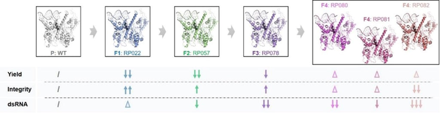 Given that the performance advantages of the aforementioned mutants stem from different mechanisms, the team has constructed DNA shuffling libraries targeting them. After screening, the team finally obtained superior-performing mutants with extreme low dsRNA generation while not affecting the yields and mRNA integrity (Figure 2). However,the yields of a mutant G47A+884G discovered by Moderna was affected[5] (unpublished).